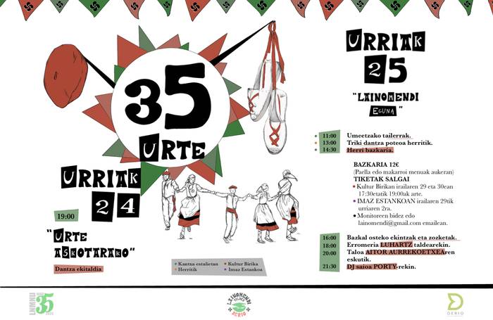 Urriaren 24an, ostiralez, Derioko frontoian dantza-taldearen ikuskizun berezia izango da, arratsaldeko 19:00etan. Bertan 200 dantzari inguruk hartuko dute parte, non dantzariez gain, dantzari ohiak, gurasoak… egongo diren. Larunbata, urriaren 25a, berriz, Martinek dioen moduan, “gozatzeko egun” bat izango da, Derioko herritar guztientzat zuzendua. Goizean umeentzako tailerrak izango dira. Honen ondoren, dantza trikipoteoa izango da, eta herri bazkaria Derioko kantxetan. Arratsaldean, Luhartzek erromeria eskainiko du, eta taloak ere dastatu ahal izango dira. Gauean, DJ-a egongo da, nahi duenak dantza dezan. Lainomendik “derioztar orori” zein “edozein txorierritarri” luzatzen die gonbidapena ospakizun honetan haiekin parte har dezaten. “35 urte hauetan egin duguna ikusita, esango nuke beste 35 ere bete ditzazkegula”, dio Martinek. Hala izan bedi.