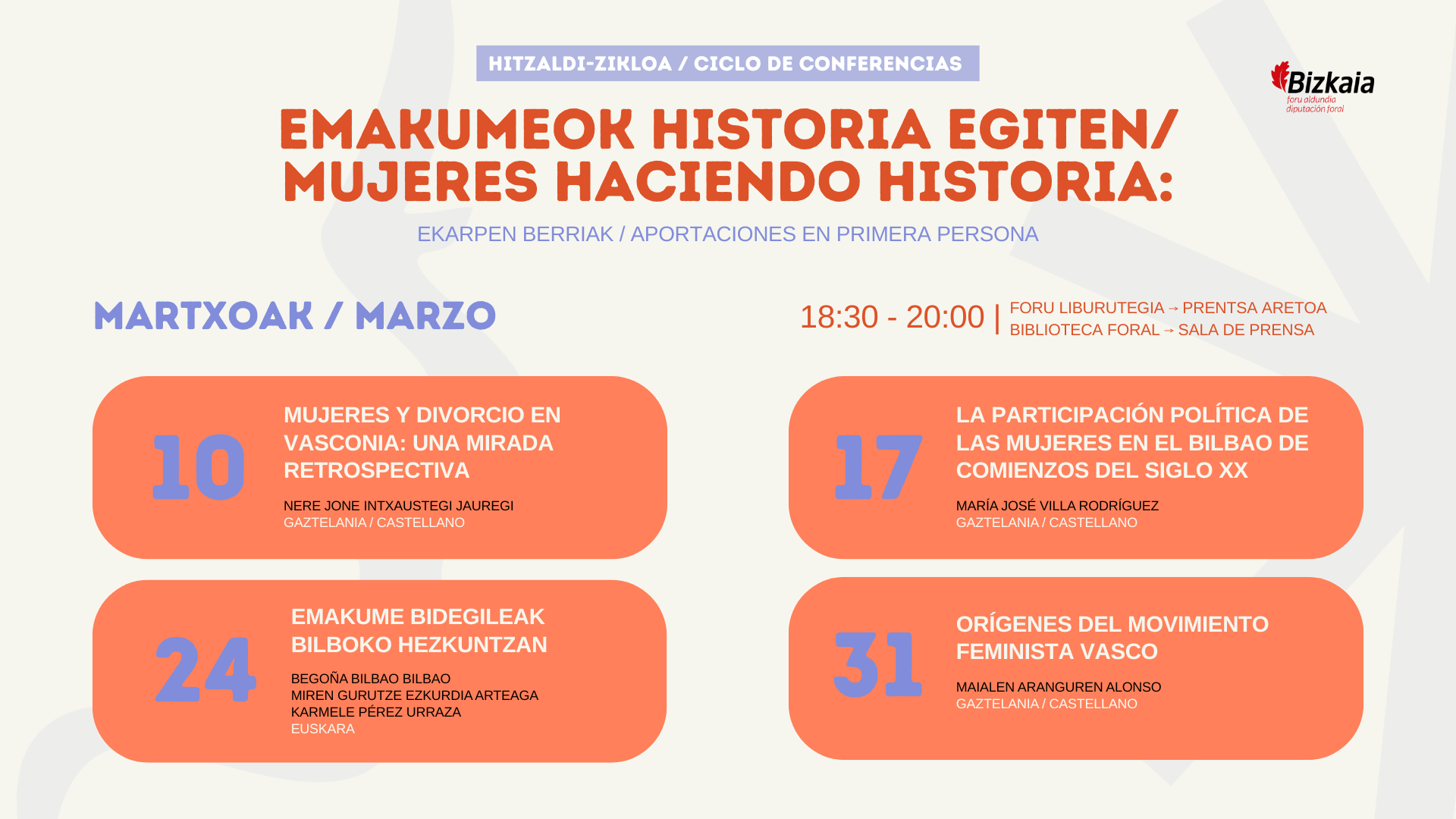 Martxoaren 10etik 31ra, asteartetan, 18:30etatik 20:00etara