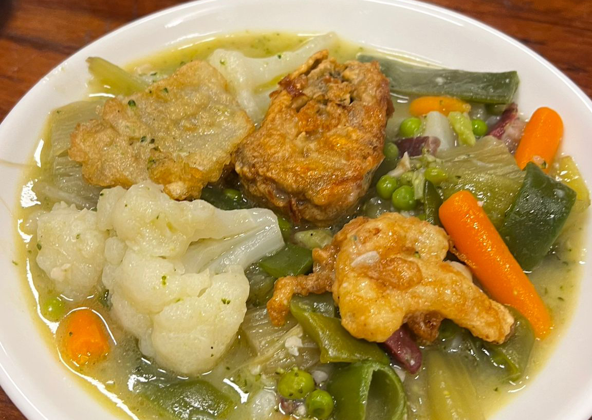 Barazki guztiak ingeles erara egosi: orburuak moztu eta zuritu gabe; azenario, patata eta arbiak torneatuak; lekak makila forman; zainzuri eta gari-zainzuriak osorik; borraja zurituta; eta zerbaren hosto berdeak kendu eta zati zuria erabili (orri-mamia).