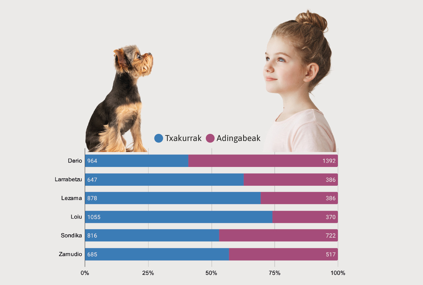 Seguru sarritan entzun duzula. Ematen du gero eta ume gutxiago dagoela gure herrietan eta txakurrak, aldiz, gero eta gehiago direla. Eta horrela da. Txorierrin 5.000tik gora txakur dago eta 3.773 adin txikiko. Loiun adibidez, 1.055 txakur omen daude eta 370 ume. Derio da herri bakarra non adingabeko gehiago dauden txakurrak baino.