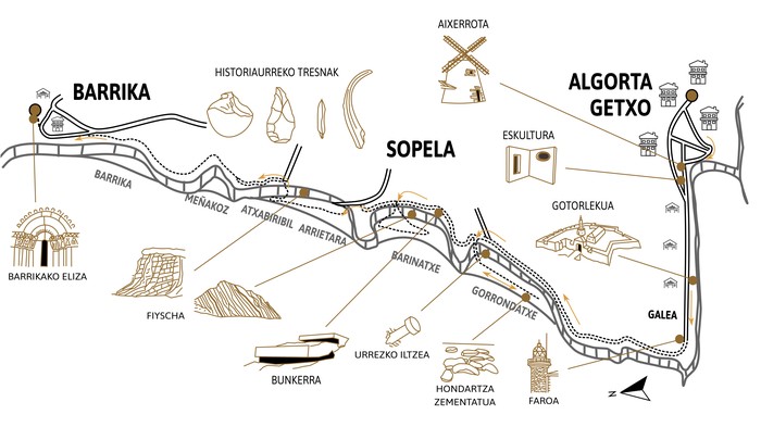Itsasoa beti lagun dugula aurrera egin dugu eta laster, eskuinaldeko parketxo batean, Memoriaren Liburua eskultura aurkitu dugu, 36ko gerran hildakoen omenez. Aurrerago ezkerretara, Galeako gotorlekua dago; XVIII. mendean eraikia. Lehenago leku bera baleak begiztatzeko zein faro legez erabili zen. Oraingo itsasargia, 1950. urtean eraikia, aurrerago aurkitu dugu, etxeak amaitzen direnean. Gorrondatxe hondartza interesgarrira jaitsi gara aldapa gogorretik, bertan flyscha hasi gara ikusten eta bertan “urrezko hiltzea” dago. Mundu mailan ondoen erakusten den sasoi bati eskainia, Lutetiar sasoia, 47,8 – 41,2 miloi urte tartea hain zuzen. 2012an jarritako plaka txiki baten ondoan dago. Hondartza honetan aurkitu zen ere espezi bateko fosil ezezaguna, “Morozovella gorrondatxensis” bataiatua. Ikustekoa da ere, hondartza zementatuak edo industria-jatorriko zaramak pilatuz sortu diren harkaitz berriak.