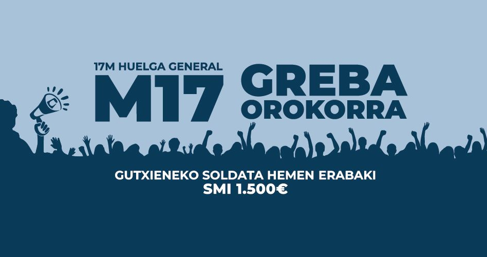 Horregatik, Hego Euskal Herriko gehiengo sindikalak martxoaren 17rako greba orokorra deitu dugu. Gutxieneko soldata propioaren alde: Euskal Herrian gure errealitateari lotutako gutxieneko soldata izateko. 1.500 euroko gutxieneko soldataren alde: herritar oro duintasunez bizitzeko. Eta aberastasuna banatzearen alde: denon artean sortutako aberastasuna hobeto banatzeko.