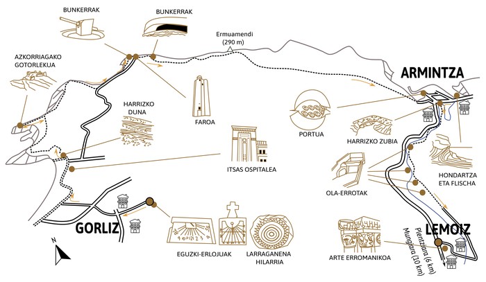 Bizkaiko kostaldetik jarraituko dugu oraingoan. Gorlizetik Armintzara egingo dugu hasteko, nahiko ezaguna den ibilbidetik, Ermuamendi igoz. Lemoizko elizaraino hurbilduko gara azkenean. Eta bidean, patxadaz joanez gero, badago zer ikusi. Hondartza eta eraikuntza ederrak, harri bihurtutako dunak, gotorlekua, bunkerrak, itsasargia, portua, errotak, arte erromanikoa... eta itsasoa beti presente gure gaurko 14 kilometroko mendi ibilbidean.