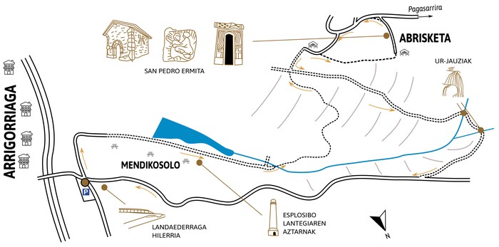 Ibilbidea Arrigorriagako Mendikosolo parke ederraren aparkalekuan hasi dugu. Parkeraino jaitsi, eta urtegiaren ondotik egin dugu aurrera, bertan zegoen esplosiboen fabrika baten aztarnak oraindik ikusi daitezke. Erreka gurutzatu marka zuri-horiak jarraituz, eta menditik gora bidezidor politetik joan gara. Errepidera helduta, laster eskuinean dagoen estratatik jarraitu, ate pare bat gurutzatu, eta XII. mendeko Abrisketako San Pedro ermitan agertu gara. Ekialdeko horman leiho prerromaniko berezia dauka, erditik mutilatuta egon arren. Hegoaldean, antzinako sarrera baten gainean, bi irudi agertzen dira eta batean bikote bat larrua jotzeko posizioan dago. Oraingo sarrera, erromanikoa ere, mendebaldean dago. Iaz, ermita inguruan indusketak egin ziren eta nekropoli bat agertu zen. Arkeologoen ustez, ermita atzeko larrean, herrixka bat egon zitekeen, oraindik induskatu barik dagoena.