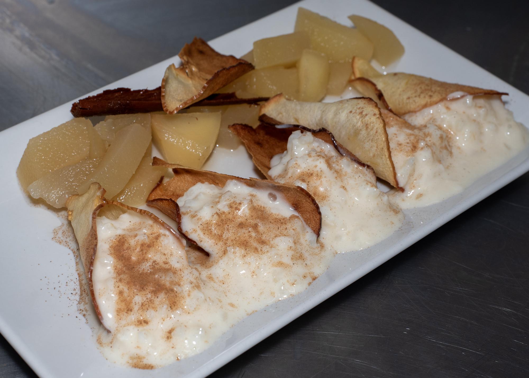 - Amaitzeko, beste kanutillo formako sagar xaflak arroz esnearekin, jarri inguruan sagar konpota eta apaindu, nahi izatekotan, kanela apur batekin.